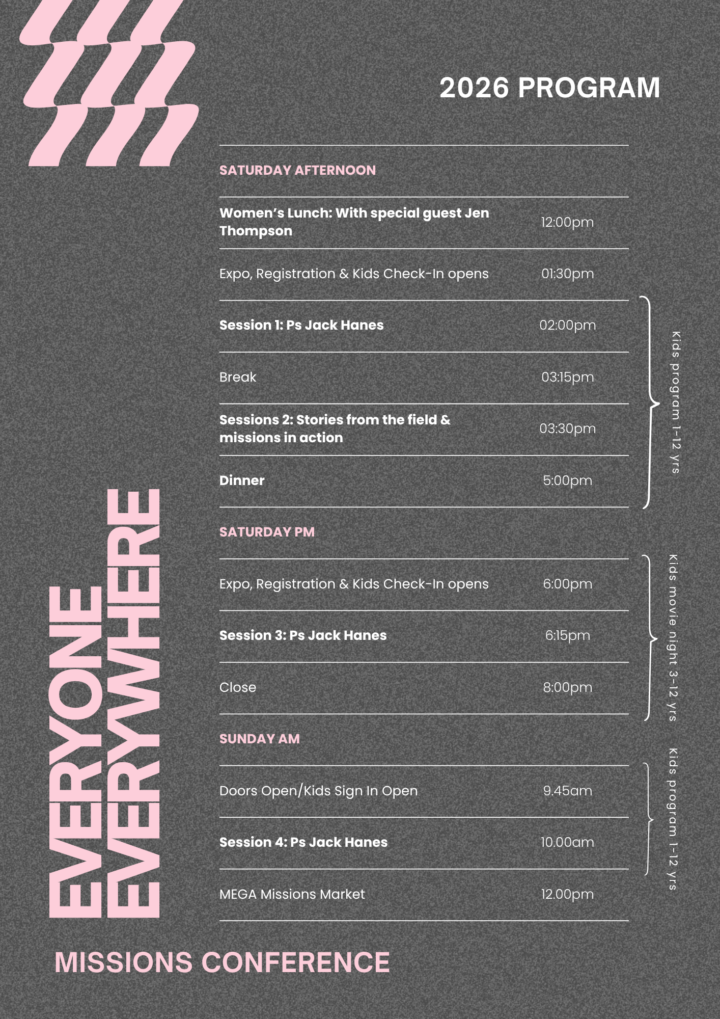 Saturday: We will enjoy some times of worship, extended ministry and teaching from Ps Jack Hanes, , a truly inspiring leader when it comes to Missions and giving. We will also have some panel sessions where you will get to hear first hand from some of our Missions Partners and have the opportunity to make your own mission giving ‘Faith Promise’. Our kids will have their own EEkids program and will also be taught about generosity and service.